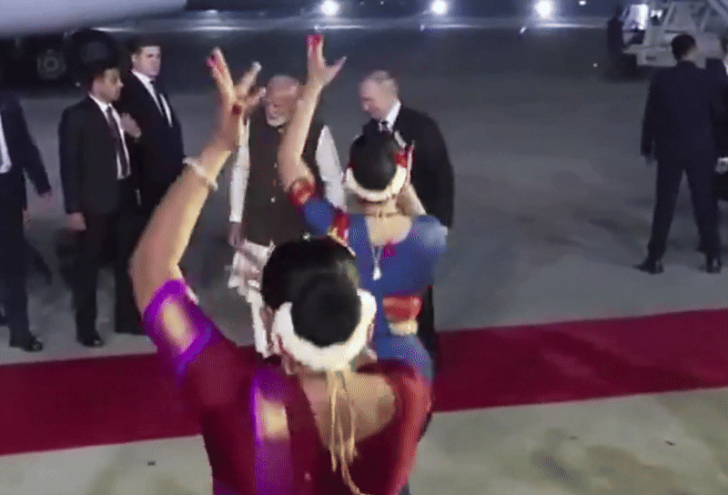 पालम एयरपोर्ट पर पुतिन के पहुंचने, पीएम पीएम से मिलने और फिर साथ निकलने का एक वीडियो न्यूज एजेंसी ANI ने साझा किया है. इस वीडियो में स्पष्ट दिख रहा है कि एयरपोर्ट पर गर्मजोशी से हुई मुलाकात के बाद पीएम मोदी और पुतिन एयरपोर्ट पर मौजूद कलाकारों की कला देखते हैं, ताली बजाकर उनका हौसला बढ़ाते हैं और फिर कार की तरफ बढ़ते हैं. लेकिन तभी अधिकारी उन्हें दूसरी तरफ जाने को कहते हैं, जिसके बाद दोनों नेता फॉर्च्यूनर में सवार होकर निकलते हैं.