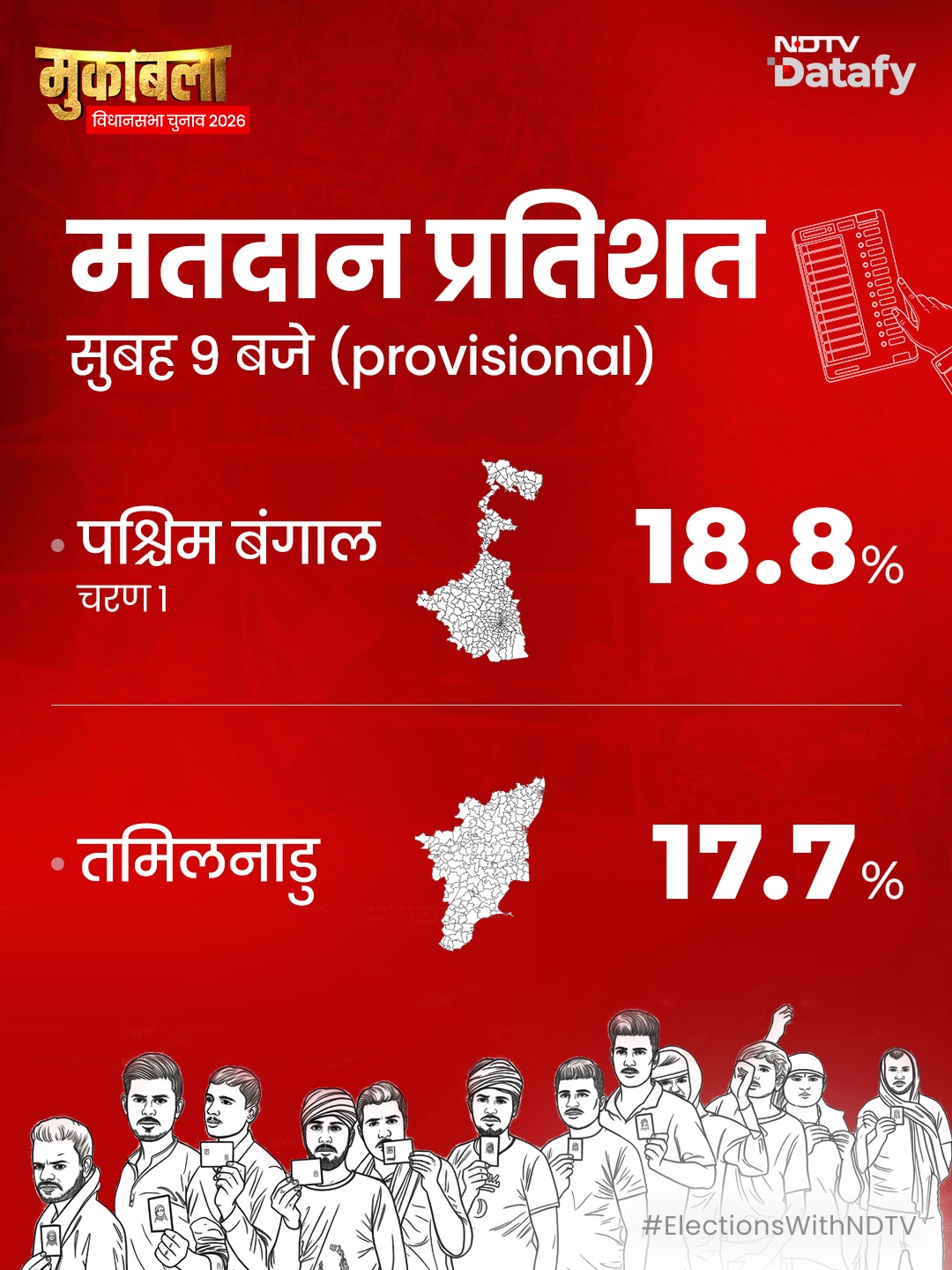 पश्चिम बंगाल में सुबह 9 बजे तक 18.76 प्रतिशत मतदान हुआ. पश्चिम मेदिनापुर में 20.5, बांकुरा में 20.2 और झारग्राम में 19.8 प्रतिशत मकदान दर्ज किया गया है.