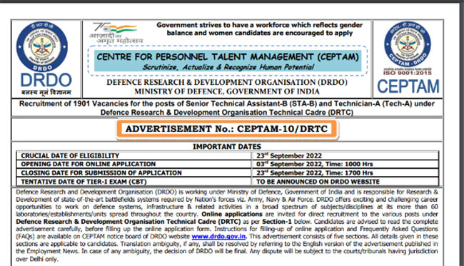 DRDO CEPTAM Recruitment 2022, Sarkari Naukri: रक्षा अनुसंधान एवं विकास संगठन, ने DRDO-CEPTAM रिक्रूटमेंट के लिए आज यानि 3 सितंबर, 2022 से सीनियर टेक्निकल असिस्टेंट-बी (Senior Technical Assistant-B) और टेक्निसियन-ए के रिक्त पदों पर भर्ती के लिए पंजीकरण प्रक्रिया शुरू कर दी गई है. जो भी उम्मीदवार इस डीआरडीओ सेप्टम भर्ती (DRDO Recruitment 2022) प्रक्रिया में भाग लेने के लिए आवेदन करना चाहते हैं, वे DRDO की ऑफिशियल वेबसाइट drdo.gov.in पर जाकर ऑनलाइन मोड में एप्लीकेशन फॉर्म भर सकते हैं. बता दें, कि उम्मीदवारों को लास्ट डेट से पहले आवेदन पत्र भरकर जमा करना होगा. डीआरडीओ भर्ती नोटिफिकेशन (DRDO CEPTAM Recruitment 2022 Notification) और आवेदन का डायरेक्ट लिंक नीचे उपलब्ध है.