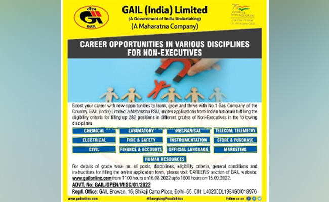 GAIL Recruitment 2022: गेल में सरकारी नौकरी करने की इच्छा रखने वाले या फिर जॉब की तलाश कर रहे उम्मीदवारों के लिए एक खुशखबरी है. गेल (इंडिया) लिमिटेड जल्द ही अपनी आधिकारिक वेबसाइट यानी gailonline.com पर नॉन एग्जीक्यूटिव पदों पर भर्ती के लिए अधिसूचना प्रकाशित करने वाला है. केमिकल, लेबोरेटरी, मैकेनिकल, टेलीकॉम/टेलीमेट्री, इलेक्ट्रिकल, फायर एंड सेफ्टी, इंस्ट्रुमेंटेशन, स्टोर एंड परचेज, सिविल, फाइनेंस एंड अकाउंट्स, ऑफिशियल लैंग्वेज, मार्केटिंग और ह्यूमन रिसोर्स के विभिन्न ग्रेड में 282 रिक्तयों पर भर्ती की जाएगी. रिक्तियों की पूरी जानकरी विस्तृत अधिसूचना के माध्यम से अधिसूचित की जाएगी. डिटेल में जानकारी पाने के लिए पूरा पढ़ें.
