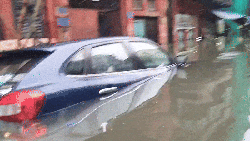 पानी में डूबी सड़कें, तैर रही नाव
