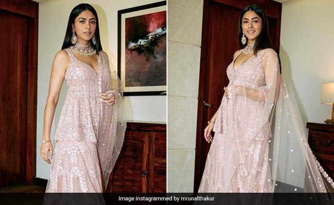 - ब्लश पिंक घाघरा सेट में मृणाल ठाकुर