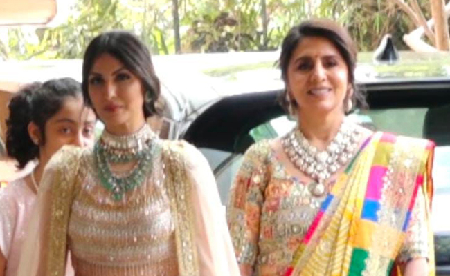 Ranbir-Alia Wedding: रणबीर कपूर की शादी में रिशतेदारों का जमघट लग चुका है और एक के बाद एक सभी शादी में शिरकत करते नजर आ रहे हैं. रणबीर (Ranbir Kapoor) की मां नीतू कपूर और बहन रिद्धिमा कपूर को शादी में पहुंचते हुए स्पॉट किया गया जहां नीतू कलरफुल तो रिद्धिमा गोल्डन लहंगे में नजर आ रही हैं. दोनों मां बेटी के लुक्स एक-दूसरे से बेहद अलग होते हुए भी खूबसूरत दिख रहे हैं. रिद्धिमा ने अपने गोल्डन लहंगे के साथ ग्रीन जूलरी पहनी है तो वहीं नीतू कपूर (Neetu Kapoor) गोल्डन स्टोन जूलरी कैरी किए नजर आ रही हैं.