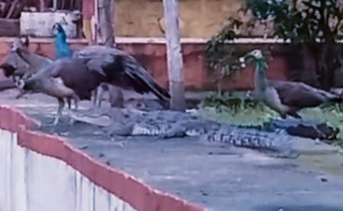 राजस्थान के बूंदी कोर्ट परिसर में प्राचीन बावड़ी के ऊपर 5 फीट लंबा मगरमच्छ दिखाई देने से हड़कंप मच गया. मगरमच्छ के पास मोर भी दाना चुगते रहे, लेकिन मगरमच्छ ने उन्हें किसी तरह का कोई नुकसान नहीं पहुंचाया. सूचना मिलने पर वन विभाग और घड़ियाल अभयारण्य के दो कर्मचारी मौके पर पहुंचे और मगरमच्छ को पकड़ने की कड़ी मशक्कत की, लेकिन वह 10 फीट ऊपर से छलांग लगाकर बावड़ी में चला गया.