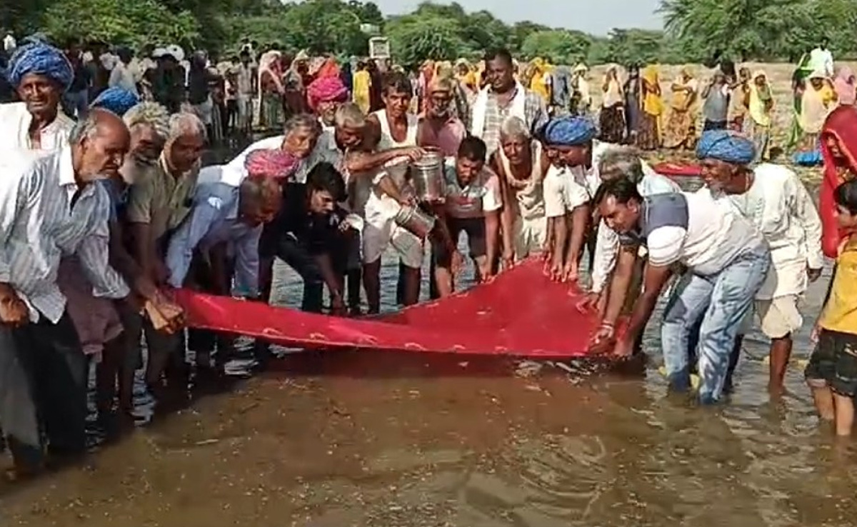 भीलवाड़ा जिले की रायपुर तहसील के धूलखेड़ा गांव में बीते तीन दशक से कोठारी नदी सूखी थी. मगर गत दिनों बिफरजाय तूफान के चलते हुई बेमौसम बरसात हुई. जिसके चलते सूखी नदी में पानी आया और लोगों के चेहरे खिल गए. पानी की अगवानी करने ढोल-बाजे के साथ डीजे पर नाचते गाते गांव वाले नदी किनारे पहुंच गए. ग्रामीणों ने न केवल कोठारी नदी का स्वागत किया, बल्कि अनुष्ठान के साथ कोठारी नदी को लाल चुनरिया ओढ़ाकर अपनी खुशी का इजहार किया.