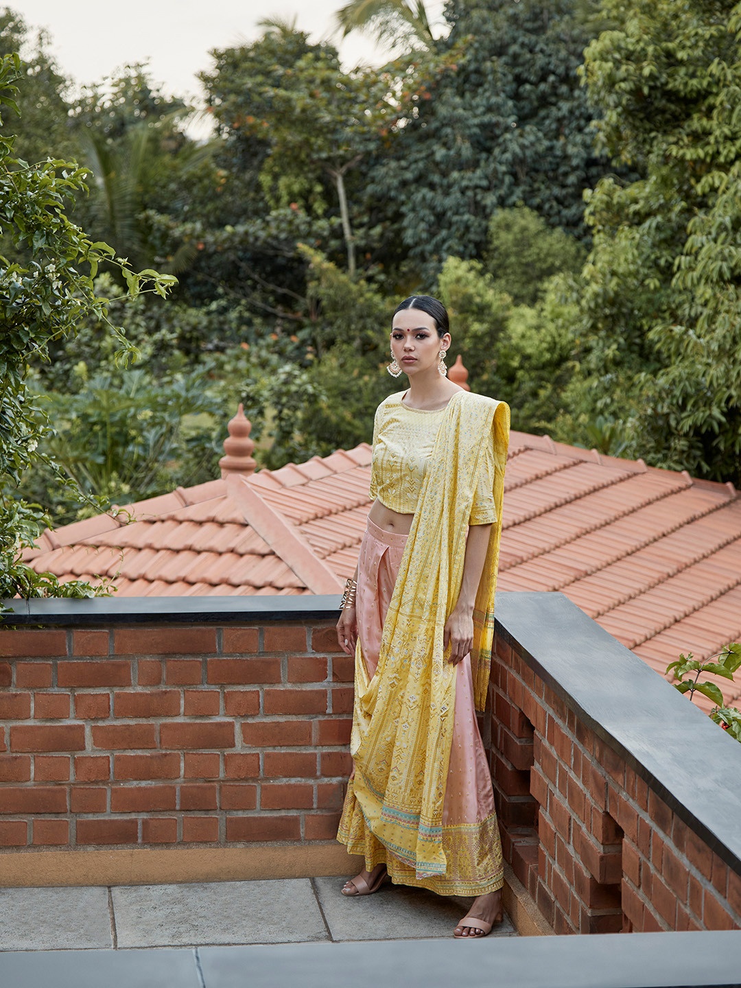 7. Women Yellow And Pink Printed Top with Palazzos And Dupatta By W
