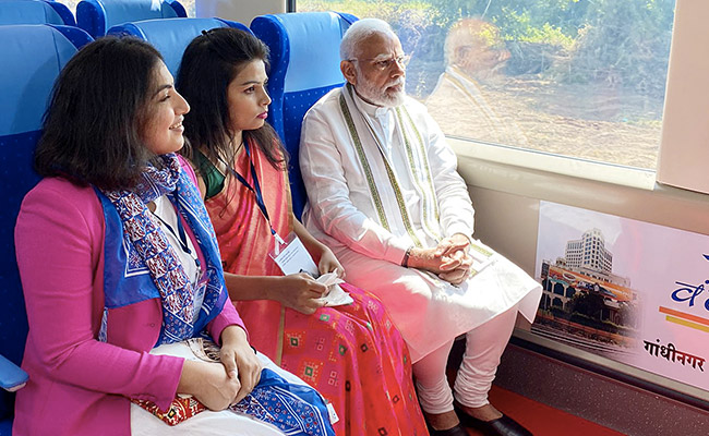 प्रधानमंत्री नरेंद्र मोदी ने गांधीनगर और मुंबई के बीच चलने वाली वंदे भारत एक्सप्रेस ट्रेन के नए संस्करण को शुक्रवार को हरी झंडी दिखाई. पीएम मोदी ने इस ट्रेन से गुजरात के गांधीनगर से कालूपुर स्टेशन तक का सफर भी किया. पीएम ने इस यात्रा के दौरान वंदे भारत एक्सप्रेस ट्रेन के डिब्बों का निरीक्षण किया और मौजूद सुविधाओं का जायजा भी लिया.