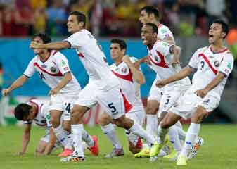 ब्रायन रूईज के शानदार प्रदर्शन से दस खिलाड़ियों के साथ खेल रहे कोस्टारिका ने रविवार की रात यहां यूनान पर पेनल्टी शूटआउट में 5-3 से जीत दर्ज करके पहली बार विश्वकप फुटबॉल के क्वार्टर फाइनल में प्रवेश किया।