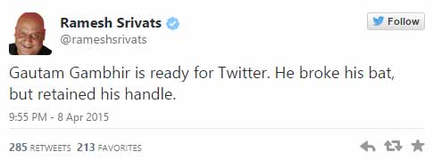 इस घटना पर सोशल मीडिया पर हंसी ठहाके का दौर चल निकला। टूटे बैट के साथ गौतम की तस्वीरें खूब शेयर हुईं।