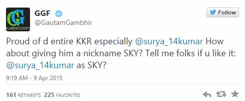 लेकिन, यह तय है कि सोशल मीडिया पर चल रहे इस हंसी ठ्ठे से गौतम गंभीर अनछुए दिखे। उन्होंने कहा, मुझे अपनी टीम केकेआर पर गर्व है। खासतौर से सूर्य कुमार पर, क्यों न उसे SKY निकनेम दे दिया जाए। अच्छा बताओ सब लोग, कैसा है यह नाम?