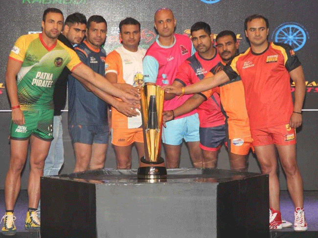 प्रो कबड्डी लीग में हिस्सा लेने वाली कुल आठ टीमों के कप्तान विजेता ट्रॉफी के साथ