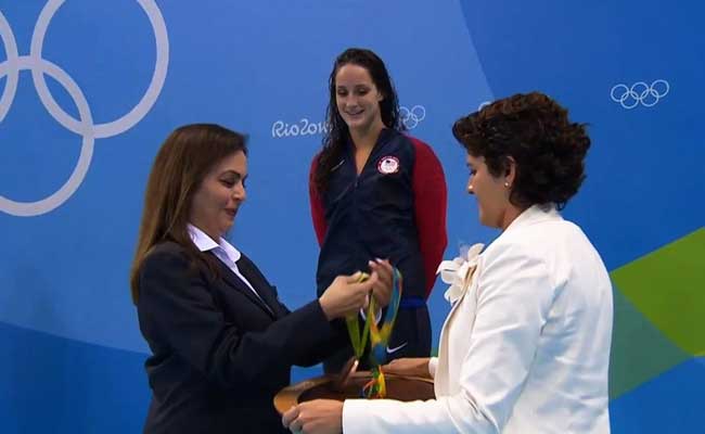 चार अगस्त को नीता आईओसी के लिए निर्वाचित हुई थीं और इसकी सदस्य बनने वाली पहली भारतीय महिला बन गईं. उन्होंने वर्ल्ड रिकार्डधारक अमेरिकी तैराक कैथलीन लेडेकी को गोल्ड, ग्रेट ब्रिटेन की जैज कार्लिन को सिल्वर और एक और अमेरिकी तैराक लिया स्मिथ को ब्रांज मेडल दिया. कैथलीन ने तीन मिनट 56.46 सेकेंड का विश्व रिकार्ड बनाते हुए स्पर्धा जीती जबकि जैज और कार्लिन ने क्रमश: चार मिनट 01.23 एवं चार मिनट 01.92 सेकेंड का समय लिया.