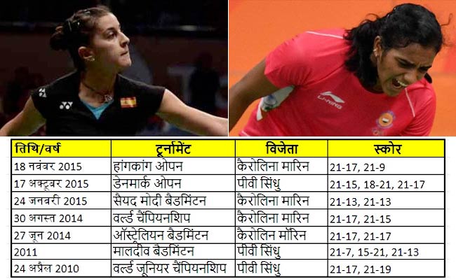 इन दोनों खिलाड़ियों के हार-जीत के रिकॉर्ड की बात करें तो दोनों खिलाड़ी सात बार आमने-सामने आई हैं और चार बार मारिन और तीन बार सिंधु के खाते में जीत आई है. एक मैच के अंतर से पिछड़ रहीं सिंधु अगर आज यह स्कोर 4-4 करने मेंं कामयाब रहीं तो गोल्ड उनकी और भारत की झोली में होगा. दोनों शटलरों के बीच पिछला मुकाबला 18 नवंबर 2015 को हांगकांग ओपन में हुआ था जिसे 23 साल की मारिन ने 21-17, 21-9 से जीता था. इससे ठीक एक माह पहले यानी 17 अक्टूबर को डेनमार्क ओपन में हुई मुकाबले में जीत सिंधु के खाते में आई थी.