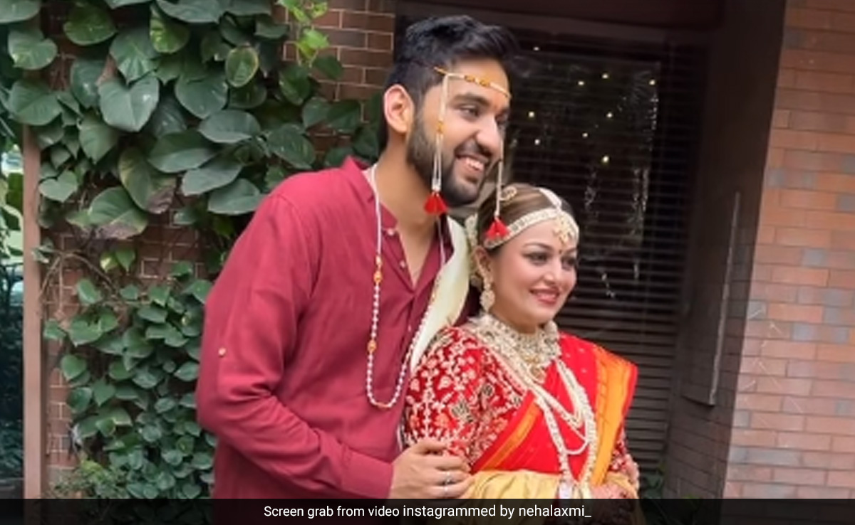 शादी के अलावा वेडिंग रिसेप्शन की बी झलक सामने आई, जिसमें नेहा लक्ष्मी अ्यर महरुन रंग के खूबसूरदत लहंगे में नजर आ रही हैं. वहीं उनके पति वाइट कलर की शेरवानी में डैशिंग लग रहे हैं.