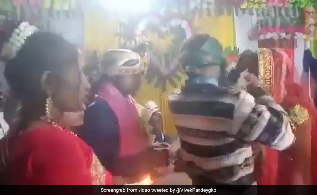 वीडियो में दिखाया गया है कि दूल्हा स्टेज पर दुल्हन को जयमाला पहनाने जा रहा था कि तभी एक शख्स अचानक स्टेज पर चढ़ता है और दूल्हे के सामने ही दुल्हन की मांग में सिंदूर भर देता है.