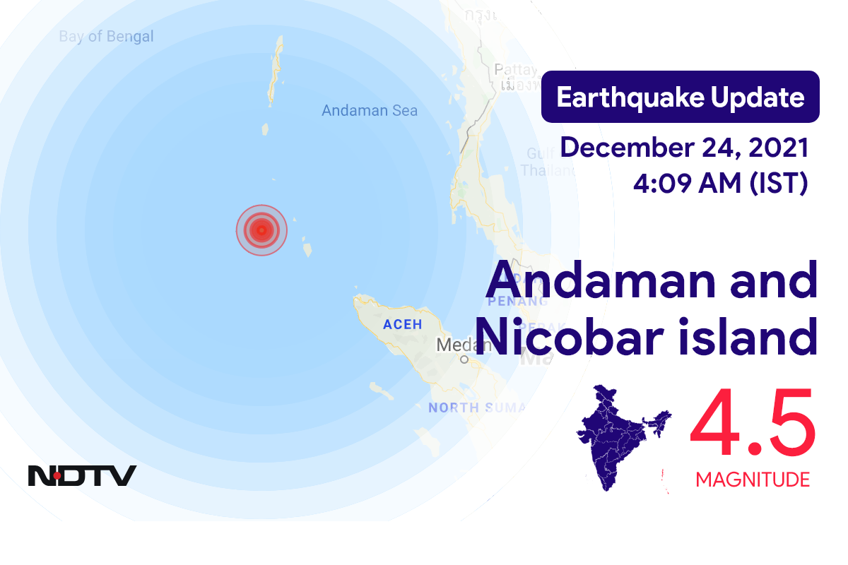 नेशनल सेंटर फॉर सिस्मोलॉजी के मुताबिक, शनिवार सुबह Diglipur में Andaman and Nicobar island के निकट रिक्टर पैमाने पर 4.5 तीव्रता वाले भूकंप के झटके महसूस किए गए.