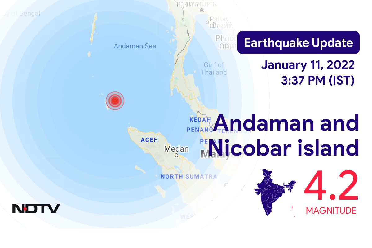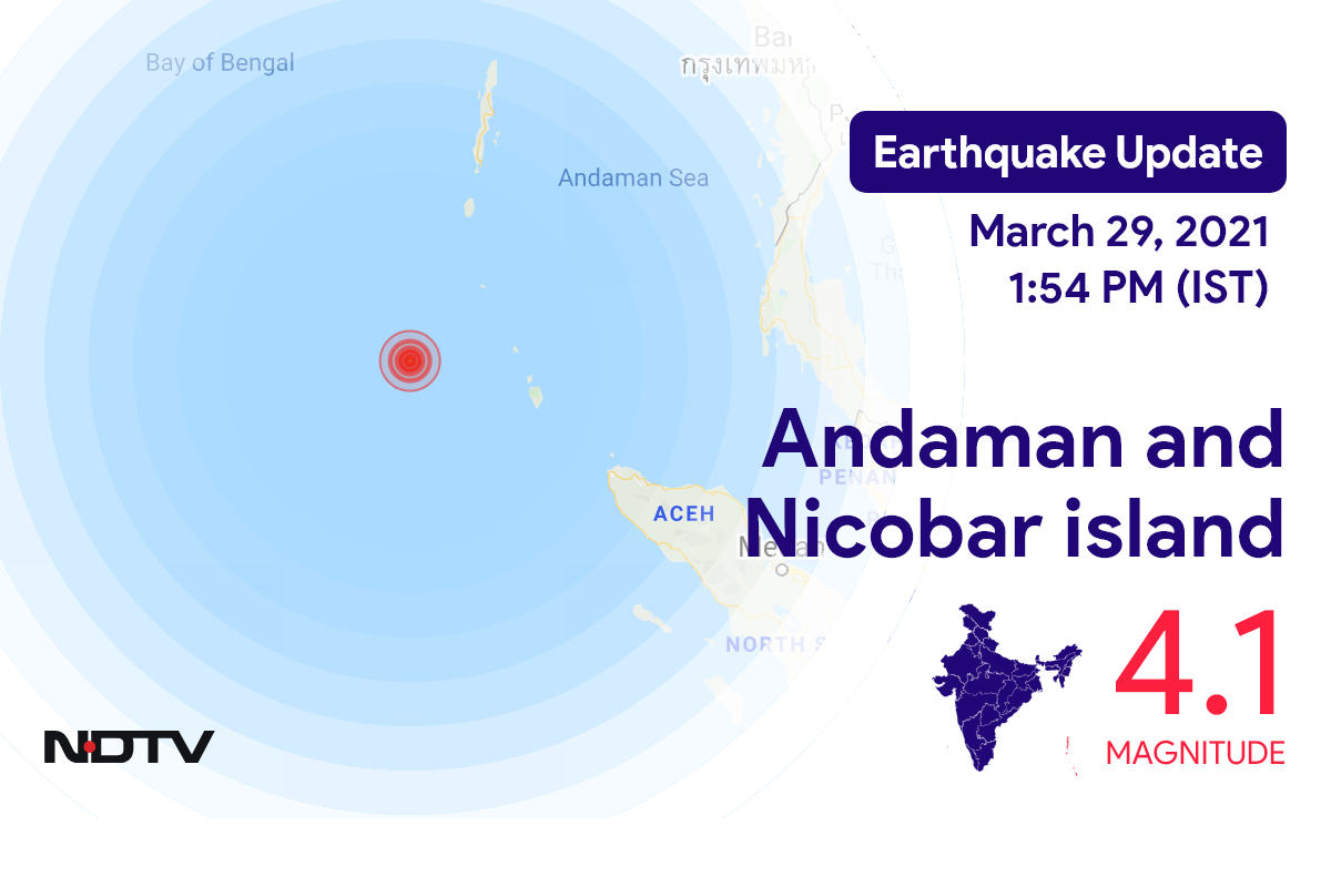 नेशनल सेंटर फॉर सिस्मोलॉजी के मुताबिक, मंगलवार सुबह Portblair में Andaman and Nicobar island के निकट रिक्टर पैमाने पर 4.2 तीव्रता वाले भूकंप के झटके महसूस किए गए.