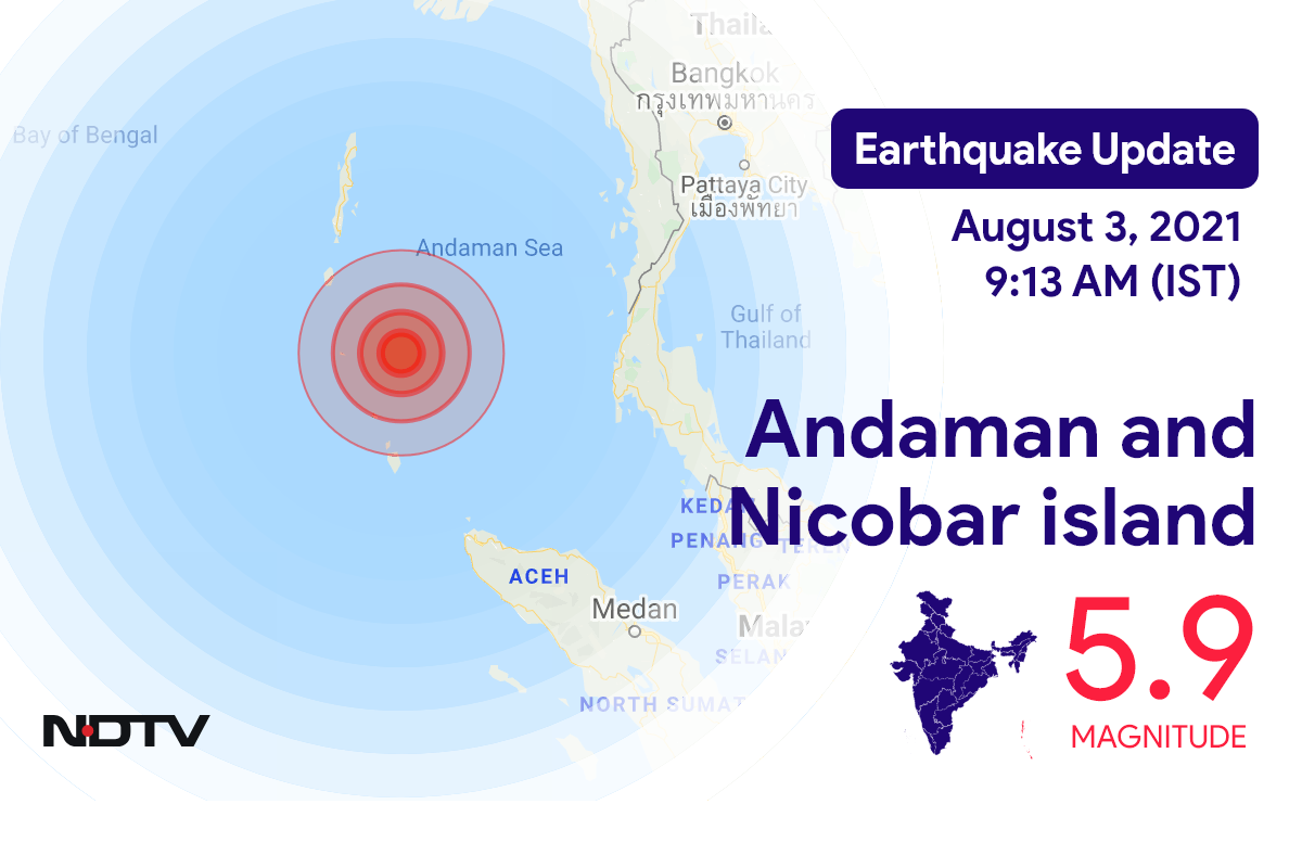 नेशनल सेंटर फॉर सिस्मोलॉजी के मुताबिक, मंगलवार सुबह Campbell Bay में Andaman and Nicobar island के निकट रिक्टर पैमाने पर 5.9 तीव्रता वाले भूकंप के झटके महसूस किए गए.