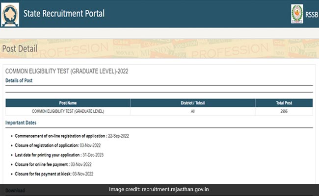 RSMSSB Rajasthan CET 2022: RSMSSB ने कॉमन एलिजिबिलिटी टेस्ट (स्नातक स्तर) 2022 के लिए ऑनलाइन आवेदन करने की तारीख 3 नवंबर तक बढ़ा दी है.