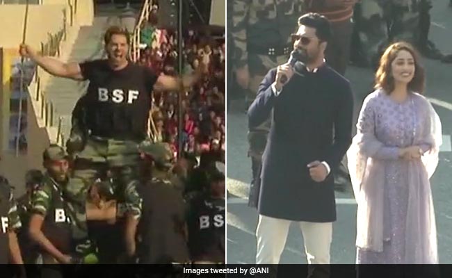 यहां मौजूद सभी सेलेब्स ने जवानों के साथ गणतंत्र दिवस के मौके पर न सिर्फ जोश से भरने वाला डांस किया, बल्कि मौजूद पब्लिक से 'भारत माता की जय' के नारे लगवाए. 'उरी: द सर्जिकल स्ट्राइक' (URI: The Surgical Strike) फिल्म से धमाल मचा चुके विक्की कौशल ने कॉलर बंद ब्लैक कलर का कुर्ता और व्हाइट पाजामा पहना, जबकि यामी गौतम ने पर्पल कलर का सूट पहन रखा है. -   ndtv.in ndtv.in
