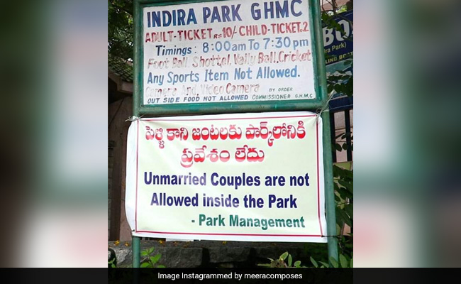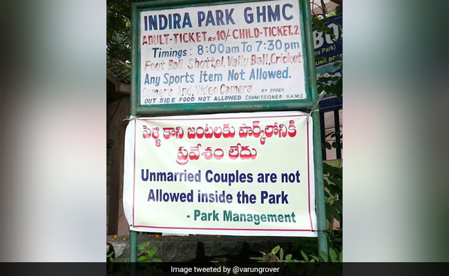 हैदराबाद के एक पार्क के बाहर लगा बैनर लोगों के बीच चर्चा विषय बन गया है और सोशल मीडिया पर इस बैनर की तस्वीर काफी तेजी से वायरल हो रही है. ये पार्क हैदराबाद के डोमालगुड़ा में है. पार्क के इस बैनर पर लिखा है- पार्क में अविवाहित जोड़ों (Unmarried couples) का आना मना है.