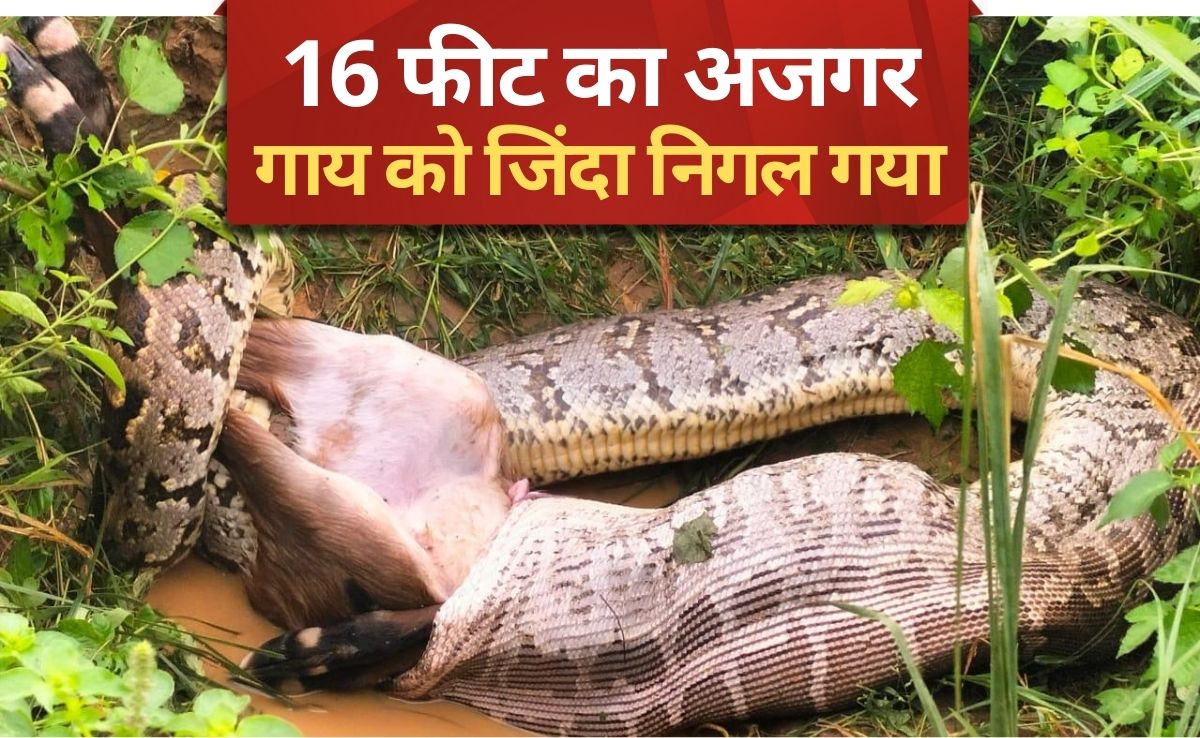 गाय को निगलने वाले अजगर की लंबाई 16 फीट है. जंगल में अजगर की नजर जैसे ही अपने शिकार पर पड़ी, वह तुरंत उस पर झपट पड़ा. देखते ही देखते अजगर ने गाय को निगलना शुरू कर दिया.