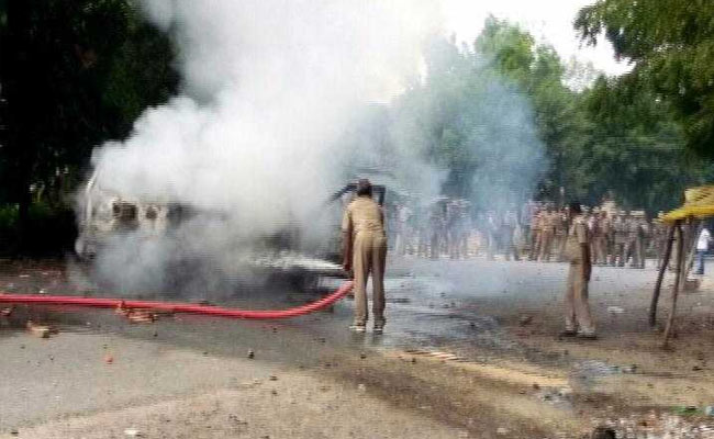 औरैया में आगजनी के बाद आग पर काबू करते पुलिस के जवान.