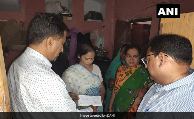 District Magistrate of Sitapur, Akhilesh Tiwari hands over a cheque of Rs 15 lakhs to #KamleshTiwari's wife. CM Yogi Adityanath had announced immediate financial assistance of Rs 15 lakhs for #KamleshTiwari's wife and a house for the family in Mahmudabad (Sitapur). pic.twitter.com/AFr4RgDXVc