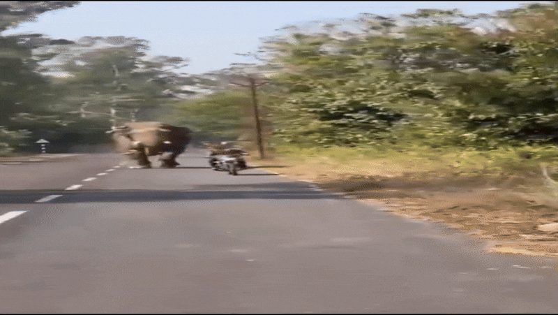 - हाथी ने अचानक जंगल से बाहर निकलकर मुख्य सड़क पर आकर वाहनों और राहगीरों में अफरातफरी मचा दी है
