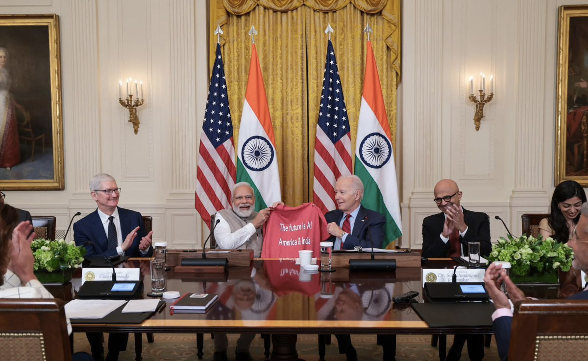 पीएम मोदी अमेरिका की यात्रा पर हैं. शुक्रवार को उन्होंने कई कंपनियों के सीईओ के साथ बैठक की. इस दौरान राष्ट्रपति बाइडेन भी उनके साथ थे. इस खास बैठक में सत्य नडेला, सुंदर पिचई, मुकेश अंबानी, आनंद महिन्द्रा और टिम कुक समेत कई अन्य सीईओ भी शामिल हुए. बैठक के दौरान अमेरिका के राष्ट्रपति जो बाइडेन ने पीएम मोदी को एक टी-शर्ट गिफ्ट किया. इस टी-शर्ट पर ,अमेरिका और भारत (AI) ही भविष्य है, कोट लिखा हुआ था. बता दें कि पीएम मोदी ने अमेरिकी संसद में दिए अपने संबोधन के दौरान एआई का जिक्र करते हुए कहा था कि जिस तरह से आने वाला भविष्य एआई का है वैसे ही दुनिया के लिए भविष्य अमेरिका और इंडिया (AI) ही है.
