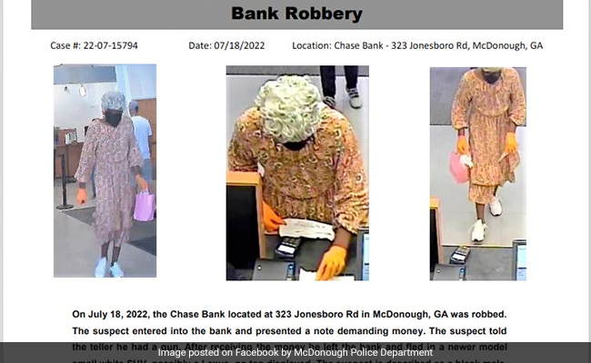 अमेरिका के जॉर्जिया में पुलिस एक बुजुर्ग महिला की तलाश के लिए जगह जगह छापा मार रही है. दरअसल, एक बुजुर्ग महिला के वेश में बैंक लुटेरे बैंक में दाखिल हुआ और लूट को अंजाम दिया. मैकडोनो पुलिस (McDonough Police) ने सोशल मीडिया पर जानकारी देते हुए बताया कि यह घटना सोमवार को दक्षिण पूर्व अटलांटा के हेनरी काउंटी में हुई. संदिग्ध को छह फुट लंबा और दुबला-पतला कद-काठी का बताया गया है. इस शख्स ने डकैती के समय फूलों की प्रिंट वाली पोशाक, सफेद स्नीकर्स, नारंगी लेटेक्स दस्ताने, एक सफेद विग और एक काले चेहरे का मुखौटा पहना रखा था.
