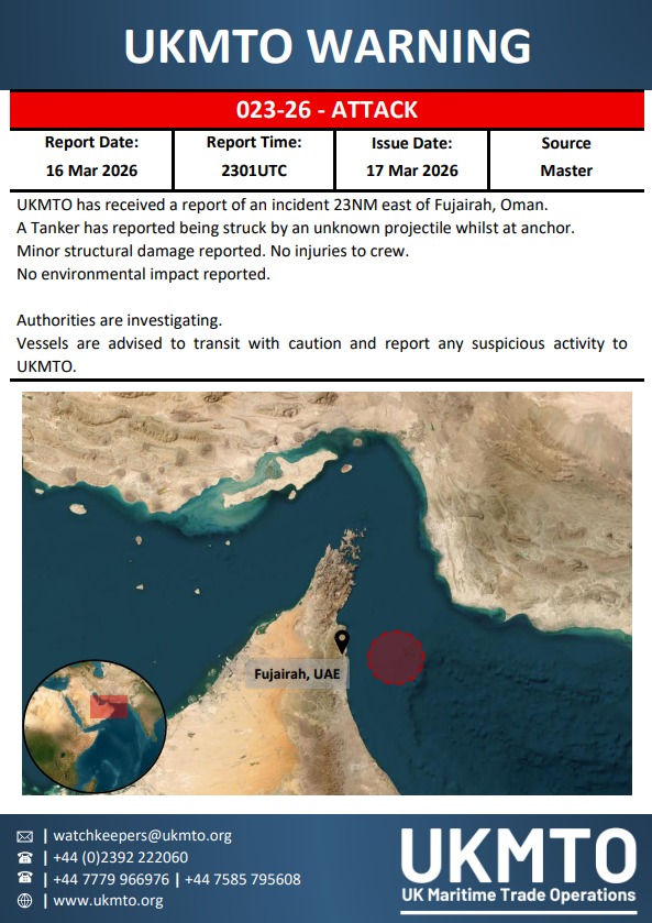 यूनाइटेड किंगडम मैरीटाइम ट्रेड ऑपरेशंस (UKMTO) ने बताया कि संयुक्त अरब अमीरात के फुजैराह से 23 समुद्री मील पूर्व में लंगर डाले एक टैंकर पर अज्ञात वस्तु से हमला किया गया.