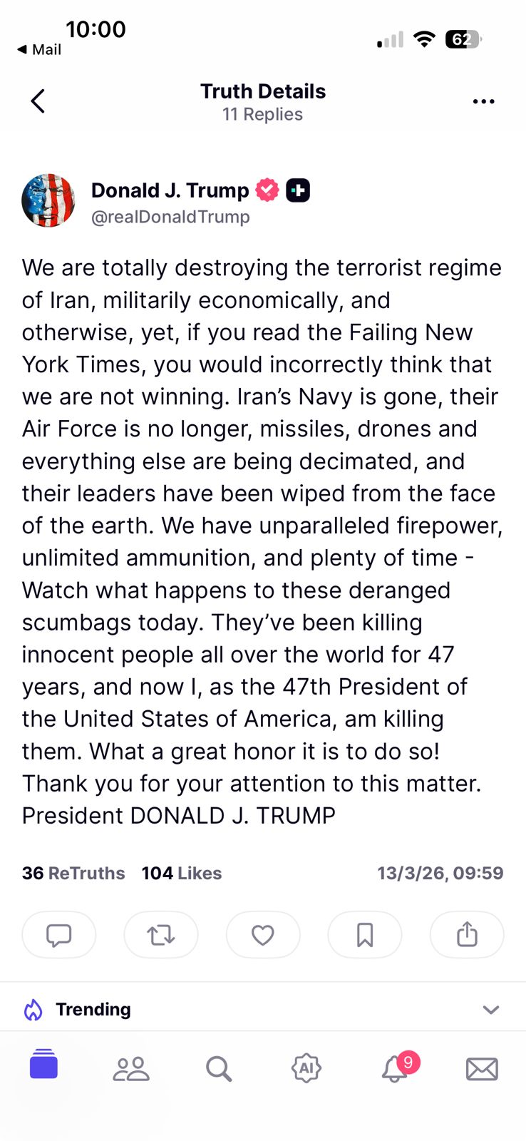 अमेरिकी राष्ट्रपति डोनाल्ड ट्रंप का कहना है कि वे ईरान के आतंकवादी शासन को सैन्य, आर्थिक और अन्य तरीकों से पूरी तरह से नष्ट कर रहे हैं. फिर भी, अगर आप न्यूयॉर्क टाइम्स को पढ़ेंगे, तो आप इस गलतफहमी में रहेंगे कि हम जीत नहीं रहे हैं. ईरान की नौसेना खत्म हो चुकी है, उनकी वायु सेना अब अस्तित्वहीन है, मिसाइलें, ड्रोन और बाकी सब कुछ नष्ट किया जा रहा है, और उनके नेता धरती से मिटा दिए गए हैं हमारे पास बेजोड़ मारक क्षमता, असीमित गोला-बारूद और पर्याप्त समय है.