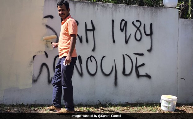 गेट्स ने मंदिर पर हमले के बाद हिंदू समुदाय की एक तस्वीर ट्वीट की. मंदिर समिति के साथ समुदाय के सदस्यों ने हिंदू विरोधी नारों दीवारों से साफ किये.