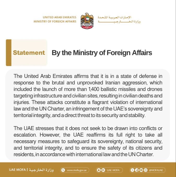 UAE ने कहा है कि वह ईरानी हमले के खिलाफ सेल्फ-डिफेंस में काम कर रहा है. इसमें इंफ्रास्ट्रक्चर और सिविलियन जगहों को निशाना बनाकर 1,400 से ज़्यादा बैलिस्टिक मिसाइल और ड्रोन लॉन्च करना शामिल है, जिससे आम लोग मारे गए. यह इंटरनेशनल कानून और UN चार्टर का गंभीर उल्लंघन है, UAE की सॉवरेनिटी और टेरिटोरियल इंटीग्रिटी का उल्लंघन है और इसकी सिक्योरिटी और स्टेबिलिटी के लिए सीधा खतरा है.