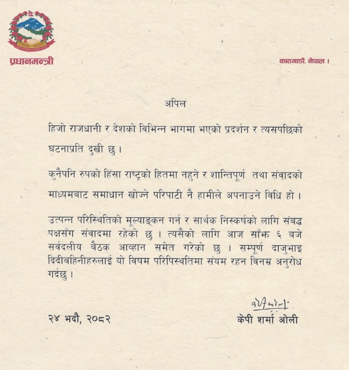 नेपाल के प्रधानमंत्री केपी शर्मा ओली ने शाम 6 बजे अपने आधिकारिक आवास पर कैबिनेट बैठक बुलाई है. यह बैठक देश में चल रहे व्यापक जन-विरोधी आंदोलन के बीच हो रही है.