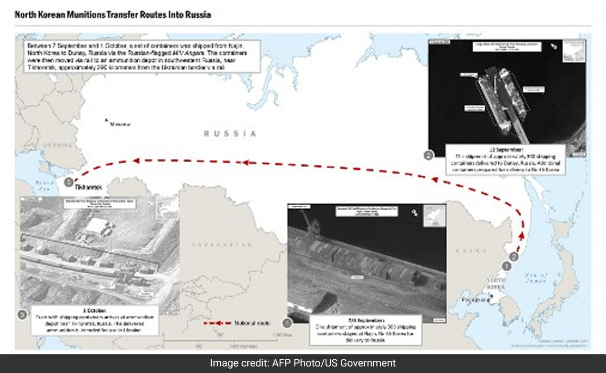 अमेरिका की ओर से जारी की गई यह तस्वीर में कथित तौर पर उत्तर कोरिया से रूस को सैन्य उपकरणों का हस्तांतरण दर्शाती है.