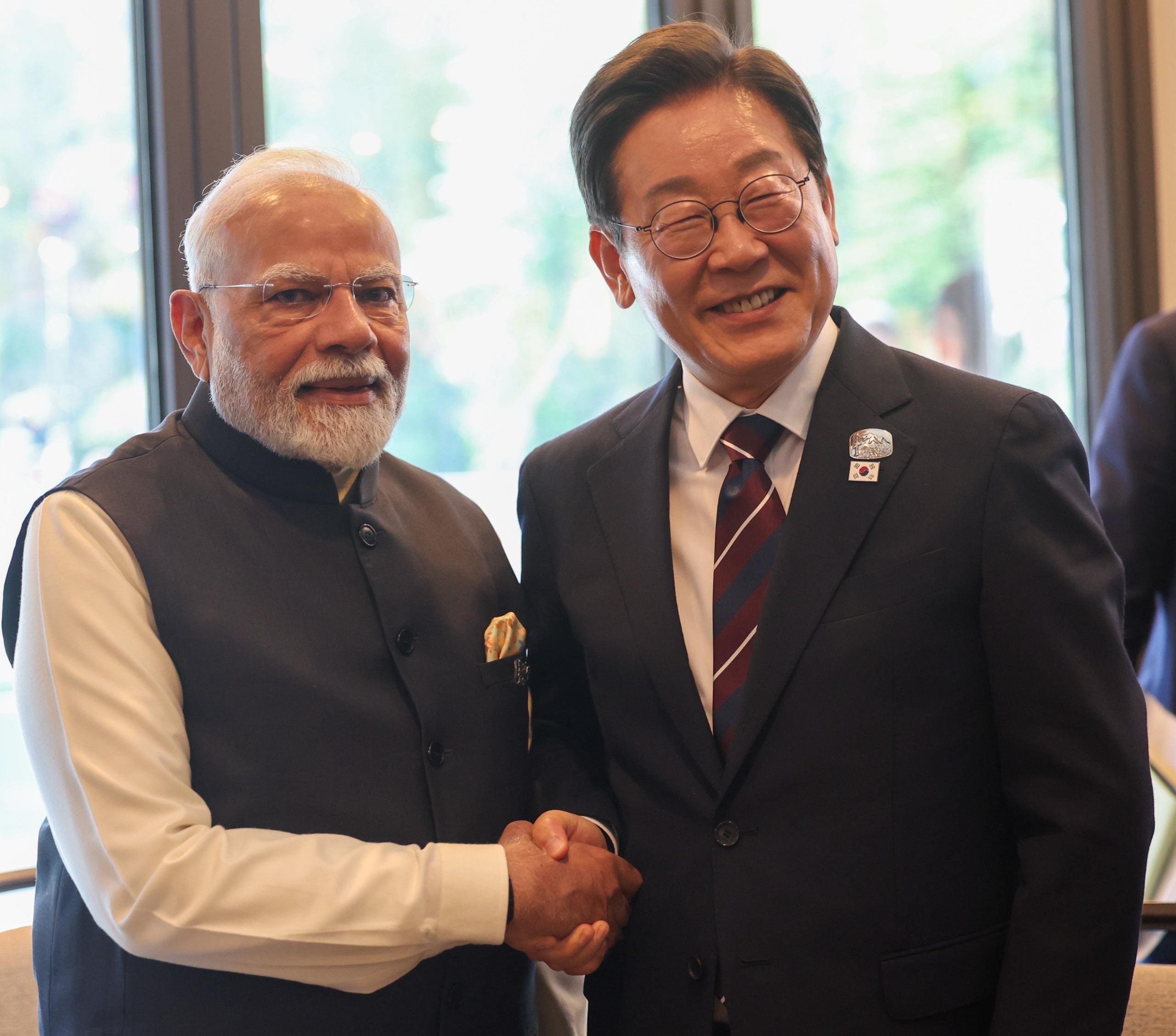 पीएम मोदी ने जी7 शिखर सम्मेलन में दक्षिण कोरिया के राष्ट्रपति ली जे-म्यांग भी मुलाकात की. उन्होंने बताया कि राष्ट्रपति ली जे-म्यांग और मेरी कनाडा में बहुत अच्छी बातचीत हुई. भारत और कोरिया गणराज्य वाणिज्य, निवेश, प्रौद्योगिकी, हरित हाइड्रोजन, जहाज निर्माण और अन्य क्षेत्रों में मिलकर काम करना चाहते हैं.