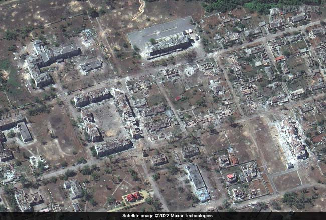 सोमवार को 24 घंटे की अवधि में मैक्सार टेक्नोलॉजीज द्वारा एकत्र की गई हाई रेजोल्यूशन तस्वीरें सेवेरोडोनेटस्क शहर और एक अस्पताल के आसपास आर्टिलरी गोलाबारी से क्षतिग्रस्त इमारतों को दिखाती हैं. टूटी छत और जलती इमारतों की तस्वीरें दिखाती हैं कि कैसे इस इलाके को भीषण गोलाबारी ने बर्बाद कर दिया है.