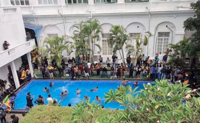 पड़ोसी देश श्रीलंका में महीनों से चले आ रहे आर्थिक-राजनीतिक संकट में शनिवार को नया मोड़ आ गया है. वहां हजारों की संख्या में प्रदर्शनकारी राष्ट्रपति गोटाबाया राजपक्षे के आधिकारिक आवास पर हमला बोल दिया. प्रदर्शनकारी राष्ट्रपति आवास में घुसे और वहां राष्ट्रपति के स्विमिंग पूल में तैरना शुरू कर दिया. ऐसी तस्वीरें सामने आई हैं, जिसमें बड़ी संख्या में राष्ट्रपति भवन के अंदर प्रदर्शनकारी स्विमिंग पूल के आसपास दिखाई दे रहे हैं. बहुतों के हाथ में श्रीलंका का राष्ट्रीय झंडा है और कई नारे लगा रहे हैं.