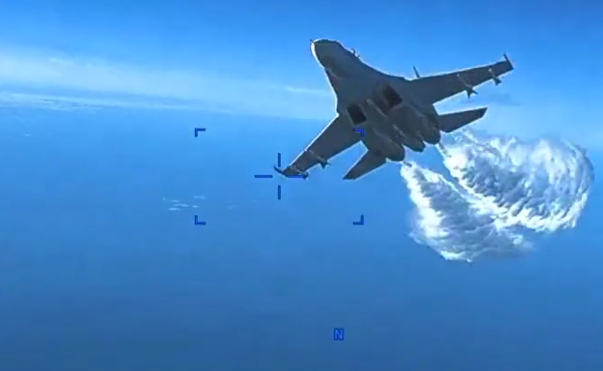 यूएस यूरोपियन कमांड द्वारा ट्विटर पर पोस्ट किए गए फुटेज में रूसी जेट को अमेरिकी वायु सेना एमक्यू-9 मानव रहित ड्रोन के पीछे की ओर आते हुए दिखाया गया है, जो इसके ऊपर से गुजरते ही ईंधन छोड़ना शुरू कर देता है. रूसी जेट के गुजरते ही वीडियो प्रसारण अचानक बंद हो जाता है. ड्रोन के प्रोपेलर को अक्षुण्ण देखा जा सकता है, और रूसी जेट फिर दूसरा प्रयास करता है. यह इस पर फिर से ईंधन छोड़ता है, जबकि इस बार और भी करीब से गुजरता है. दूसरे चालाकी भरे प्रयास के बाद एक प्रोपेलर को क्षतिग्रस्त देखा जा सकता है.