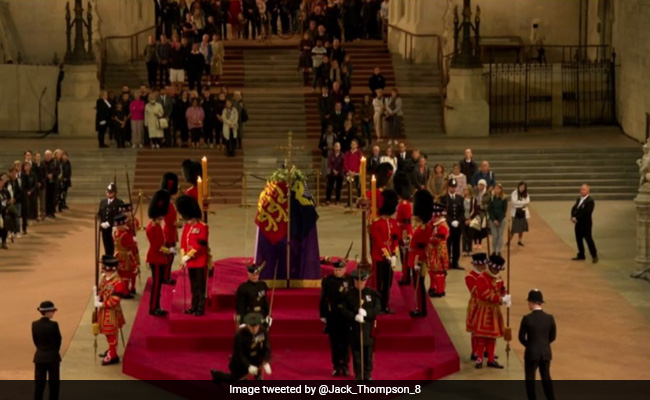 इसके बाद ताबूत को एक ऊंचे चबूतरे पर रखा गया. अंतिम संस्कार से पहले ‘लाइंग-इन-स्टेट' चरण शुरू हुआ और अनेक अधिकारी इस दौरान निगरानी रखेंगे. इस दौरान महारानी के ताबूत को चार दिन के लिए इस अवस्था में रखा जाएगा और लोग उनकी अंतिम झलक पा सकेंगे.