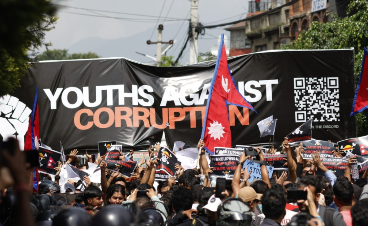 नेपाल की राजधानी काठमांडू में संसद की दीवार पर चढ़कर भ्रष्टाचार और सोशल मीडिया पर पाबंदी के खिलाफ प्रदर्शन करते लोग.