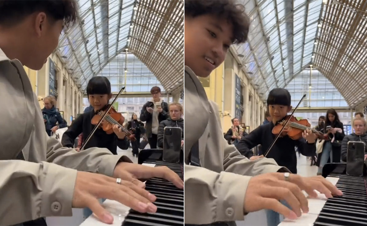 River Flows In You violin and piano duet: संगीत की कोई जुबान नहीं होती, न ही ये कोई सरहद को जानता है. संगीत तो बस संगीत होता है, जो एक वाद्य की भाषा समझता है. बेतार वाद्यों से निकलने वाले सुहाने सुर होठों पर मुस्कान बन कर छा जाते हैं. फिर चाहें आप इन्हें लाइव सुने या सोशल मीडिया पर सुने. संगीत की मुस्कान बिखेरने वाला ऐसा ही एक वीडियो ट्विटर पर वायरल हो रहा है. असल में जब ये नजारा दिख रहा होगा, तब आसपास के लोग सब भूल कर इस नजारे में खो गए थे और अब जब ये नजारा वायरल हो रहा है, तो सोशल मीडिया प्रेमी भी इस वीडियो में डूबते जा रहे हैं.