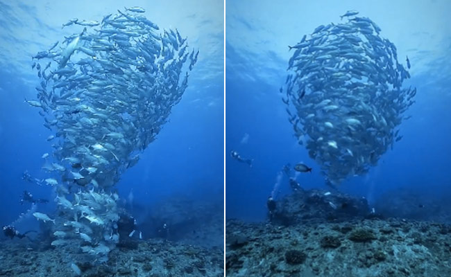 ट्विटर पर शेयर हुए इस वीडियो में समुंदर के गहरे नीले पानी में ढेरों मछलियां तैरती दिख रही हैं. इस वीडियो में समंदर के गहरे पानी के अंदर की दुनिया की झलक देखी जा सकती है. वीडियो में ढेर सारी मछलियां एक साथ मिलकर ऐसा गोल घेरा बनाती हैं, जिसे देखकर ऐसा लग रहा है मानो जैसे मछलियों का चक्रवात उठ रहा हो. समंदर की सतह से ऊपर और पानी की सतह के नीचे ये मछलियां एक खूबसूरत सी आकृति बना कर तैरती नजर आ रही हैं. वीडियो इतना खूबसूरत दिख रहा है, जो किसी का भी दिल जीत ले.