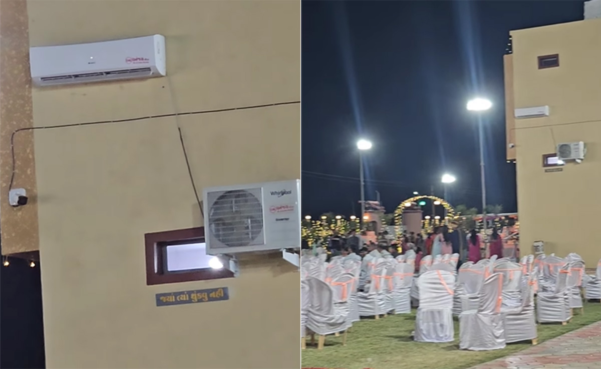 इंस्टाग्राम पर एके जडेजा नाम के अकाउंट ने इस वीडियो को शेयर किया है. इस वीडियो को देखकर ये अंदाजा लगाया जा सकता है कि, यह शादी या फिर किसी बड़ी पार्टी के जश्न का है. वैसे तो इस पार्टी में सब कुछ नॉर्मल नजर आ रहा है, लेकिन एक दीवार पर लगा एसी जरूर चौंका देने वाला है. चौंकाने वाली बात इसलिए है, क्योंकि एसी की आउटर यूनिट तो बाहर है ही एसी की इनर यूनिट, जो दरअसल ठंडी हवा देने का काम करती है, वो भी बाहर की तरफ ही लगा हुआ है. इस वीडियो को पोस्ट कर कैप्शन में लिखा गया है कि, 'हिम्मत चाहिए ऐसा काम करने के लिए बाकी तो सब आनंद ही है.'