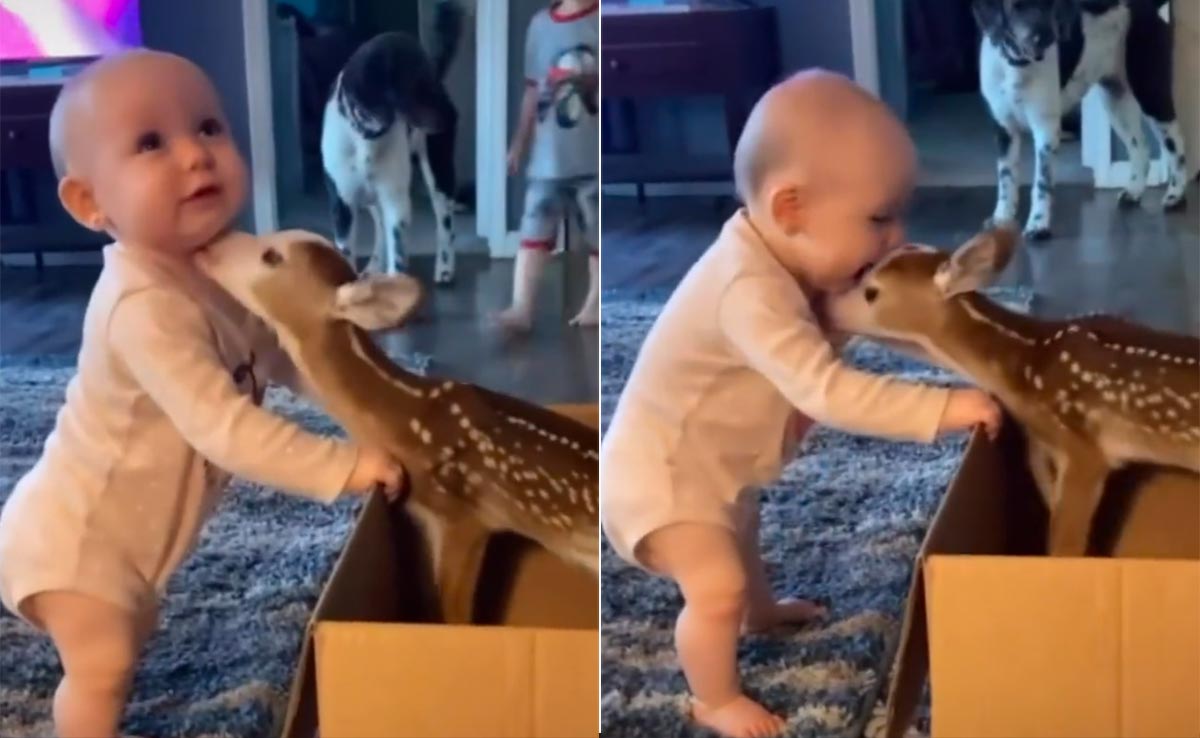 बच्चे के साथ खेलता नन्हा हिरण (Toddler Plays With Baby Deer)