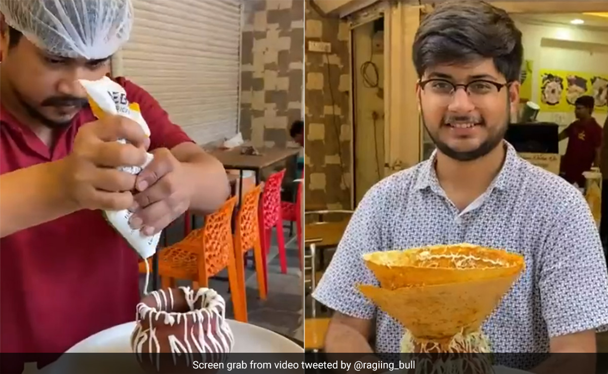 वीडियो को ट्विटर यूजर दीपक प्रभु (@ragiing_bull) ने शेयर किया, जिन्होंने इसे केवल "#matkadosa" कैप्शन दिया. यह डोसा बनाने के एक शख्स के स्टेप बाए स्टेप तरीके को दिखाता है - वह पहले सब्जियों को भूनता है और उन्हें चाट मसाला, केचप, सोया सॉस और बहुत कुछ के साथ सीज़न करता है. वह पनीर के टुकड़ों को डालता है और सामग्री को कुछ और भूनता है. अलग से, वह एक छोटे मटका पर मेयोनेज़ छिड़कता है. वह कटा हुआ गोभी और पनीर भी जोड़ता है. इसके बाद वह तवा पर असली डोसा बनाना शुरू करते हैं. वह फिलिंग जोड़ता है और ऊपर से ढेर सारा चीज़ कद्दूकस करता है. अंत में, वह डोसा का एक शंकु आकार बनाता है और इसे मटके में, कोने-नीचे की ओर रखता है. नीचे पूरा वीडियो देखें: