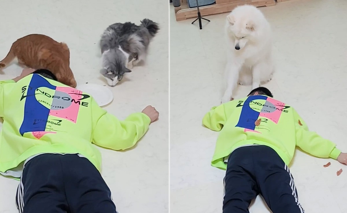 सोशल मीडिया रक एक वीडियो वायरल हो रहा है. इस वीडियो में देखा जा सकता है कि शख्स अपने पालतू जानवरों के सामने मरने का नाटक करता है. सबसे पहले बिल्लियों के सामने नाटक करता है. शख्स के हाथ में कुछ खाने की चीज़ होती है. जैसे ही वो फर्श पर गिरता है वैसे ही बिल्लियां शख्स को अनदेखा कर फर्श पर रखी खाने की चीज़ों को खाने में व्यस्त हो जाती हैं. उन्हें मालिक की कोई चिंता नहीं होती है, लेकिन जैसे ही शख्स डॉग के सामने ये नाटक करता है तो कुछ अलग ही देखने को मिलता है.