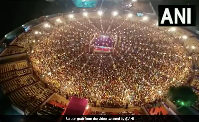 वीएनएफ के ड्रोन फुटेज में हजारों गरबा उत्साही लोगों का एक-दूसरे के साथ लगभग पूर्ण तालमेल में घूमते हुए एक आश्चर्यजनक वीडियो दिखाया गया है.